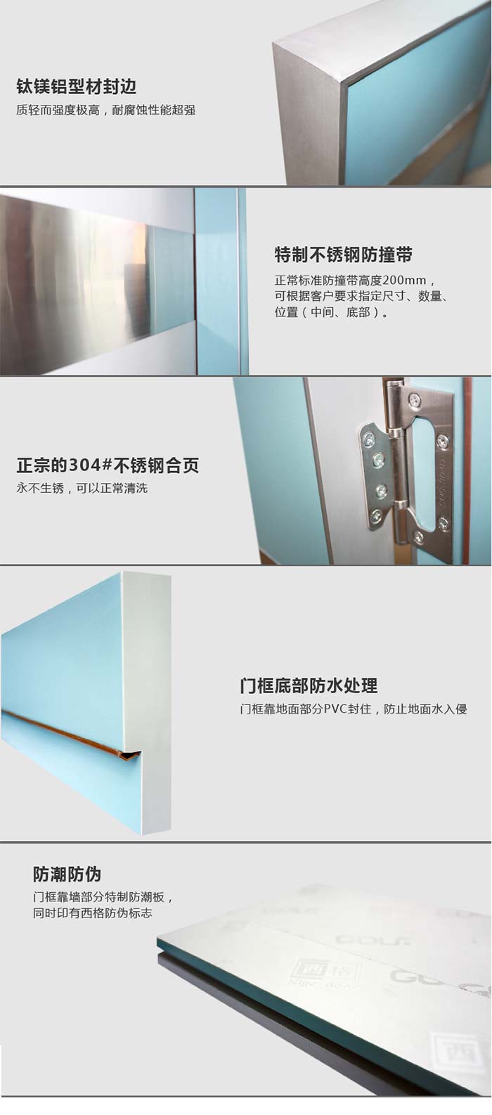 鈦鎂鋁型材封邊 ——更好的保護 門邊角,雙重倒扣式設(shè)計,永不脫落。特制不銹鋼防撞帶——耐撞擊、不凹陷、不變形、不刮傷、耐腐蝕。